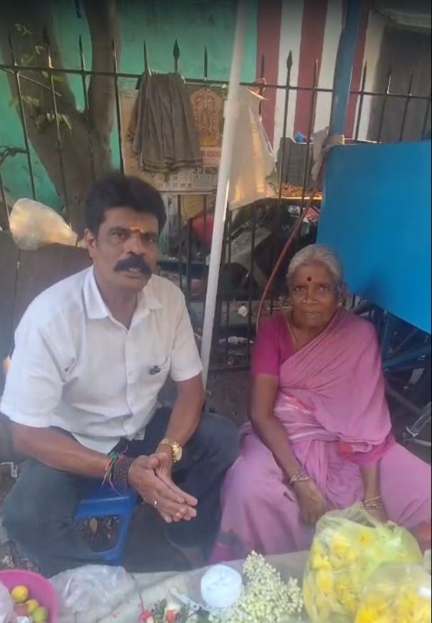 சென்னை, மயிலாப்பூர் காரணீஸ்வரர் கோவில் வாசலில் அஞ்சலை அம்மாள் (வயது 72) என்ற முதியபெண்மணி கடந்த 30 ஆண்டுகளாக தினந்தோறும் அதிகாலை வேளயில் இருந்து மதியம் வரையும் பிற்பகல் 4.00 மணியிலிருந்து இரவு 9 மணி வரையிலும் பூ வியாபாரம் செய்து வருவதை அறிந்தோம்.